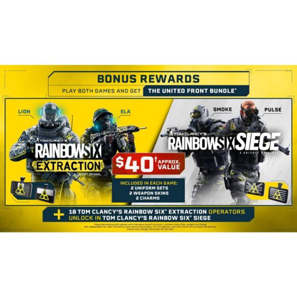 • Bundle also includes 4 crossover gearsets, Rainbow Six Siege Deluxe Edition with all 18 Rainbow Six Extraction operators unlocked, plus 3 EXCLUSIVE Epic gearsets and XP boosters in Rainbow Six Extraction.